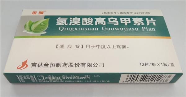 【藥品名稱】氫溴酸高烏甲素片 【商品名/商標(biāo)】 金盟【規(guī)格】5mg 【主要成份】本品主要成份為氫溴酸高烏甲素片。 【性狀】本品為糖衣片,除去糖衣后顯白色。