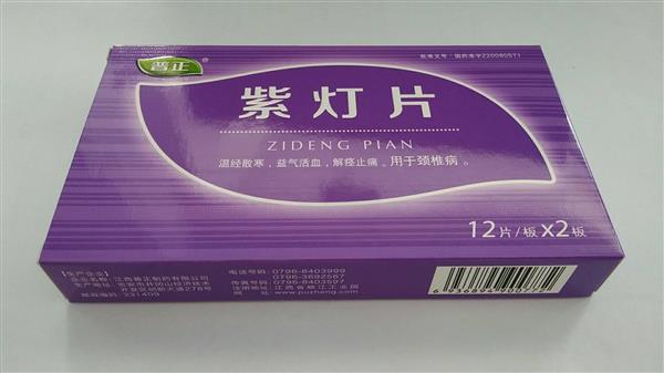 【藥品名稱】紫燈片 【商品名/商標】普正 【規(guī)格】每片重0.54克 【主要成份】燈盞細辛,紫丹參,三七,葛根,甘草。 【性狀】本品為薄膜衣片,除去薄膜衣后顯黃棕色至棕褐色;氣香,味甜,微苦。 【適應癥】彝醫(yī):勒背諾,吾格且格諾。 中醫(yī):溫經(jīng)散寒,益氣活血,解痙止痛。用于頸椎病。 【用法用量】口服,一次4片,一日3次。 【注意事項】服藥期間忌食酸冷。 【貯藏】密封。 【包裝】鋁塑包裝,12片/板×2板/盒。 【有效期】24個月 【生產(chǎn)廠家】江西普正制藥有限公司 【批準文號】國藥準字Z20080571 【生產(chǎn)地址】吉安市井岡山經(jīng)濟技術(shù)開發(fā)區(qū)創(chuàng)新大道278號 |